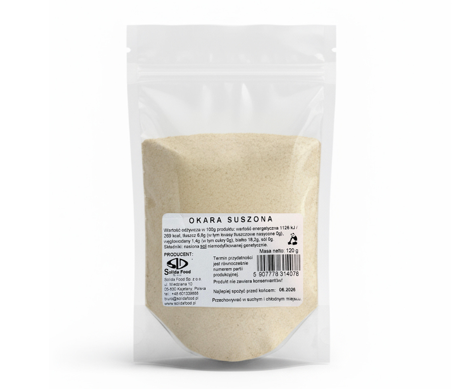 Okara sojowa to naturalna pulpa wytwarzana podczas produkcji tofu. Bogata w błonnik, białko i składniki odżywcze, idealna do dań wytrawnych i słodkich. Świetnie sprawdza się w kotletach, wypiekach, pastach i jako dodatek do zup.